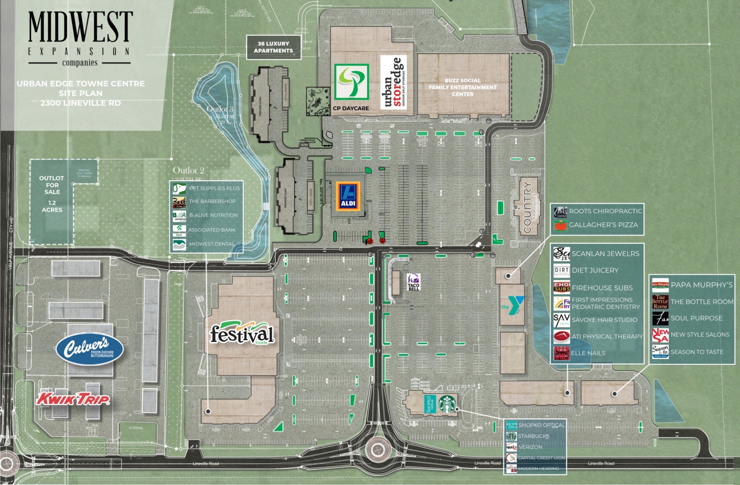 Access the Urban Edge Towne Centre from any of the four entry points. Three entries are accessible from Lineville Road, while a fourth entry can be found on Velp Avenue. Howard-Suamico is an actively growing community, with 11,800 cars passing through Lineville Road on an average day.